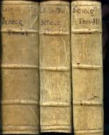 3 voll. in-12° (145x82mm), pp. 900; (24), 725; 646, (2); legatura coeva p. pergamena con titolo e tomaisons manoscritte in antico ai dorsi. Frontespizi calcografici figurati con Seneca morente. Alcune testatine e capilettera xilografici ornati. Lavori di tarlo ai risguardi. Altri lavori di tarlo con perdite di testo al frontespizio e alle prime pp. del secondo vol. Mancanze marginali alle pp. 193-194 del primo vol. e alle pp. 3-4 del terzo vol. Bell'esemplare. Edizione parigina secentesca delle opere filosofiche complete di Seneca.