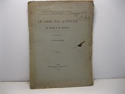 In 4, pp. 108 con foto in b/n n.t., 2 tavv. sinottiche rip. e 5 tavv. f.t. P. post. rifatto. Macchia d'inchiostro al p. ant. Br. ed. Argomenti: L'Egitto e Creta, I primi bronzi dell'Egitto, Pugnali e coltelli del Museo di Candia, La Tholos piu' antica di Haghia Triada, I pugnali di argento di Kumasa, Il sepolcreto di Haghia Triada descritto dal Paribeni, Bronzi del primo palazzo di Festo, La necropoli di Cnosso, Scuri, accette e bipenni di rame e di bronzo del Museo di Candia, Le armi votive, Armi di bronzo di Micene e raffronti con quelle di Creta, Armi preelleniche nel Museo di Siracusa, L'eta' del rame in Italia, Le falci preistoriche, Bronzi delle terremare nel Museo di Modena, La diffusione del rame e del bronzo in Europa raffrontata con la teoria degli Indo-Germani.