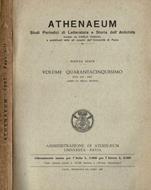 Annata 1967, anno LV, composta da 1 fascicolo, della Rivista di Studi Periodici di Letteratura e Storia dell'Antichità " Athenaeum ", con testi plurilingue, fondata da Carlo Pascal e diretta da Enrica Malcovati, disponibile volume 45°, Fasc. I-II, nuova serie. Brossura commerciale, copertina morbida monocolore, imbrunita dalla luce, velata da ombre di polvere e segnata da comuni sgualciture da conservazione, i fogli, per circa la metà intonsi, appaiono ben conservati, malgrado la decisa scuritura. N. pag. 253.