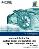 Autodesk Fusion 360 Surface Design and Sculpting with T-Spline Surfaces (5th Edition) textbook has been designed for instructor-led courses as well as self-paced learning. It is intended to help engineers and designers interested in learning Autodesk Fusion 360 for creating complex shape real-world models by using surface and T-Spline modeling techniques. This textbook is a great help for Autodesk Fusion 360 users who are new to surface and T-Spline modeling. It consists of a total of 232 pages covering the Surface and Form/Sculpt environments of Autodesk Fusion 360. It teaches users to use Autodesk Fusion 360 mechanical design software for creating complex shapes, three-dimensional surfaces and T-Spline models of zero thickness. This edition of textbook has been developed using Autodesk Fusion 360 software version: V.2.0.11685 (December 2021 Product Update). This textbook not only focuses on the usage of the tools and commands of Autodesk Fusion 360 for creating surface and T-Spline models but also on the concept of design. Every chapter in this textbook contains Tutorials followed by theoretical description, that provide users with step-by-step instructions for creating surface designs and sculpting with T-Spline surfaces. Moreover, every chapter ends with Hands-on Test Drives which allow users to experience the user friendly and powerful capacities of Autodesk Fusion 360.