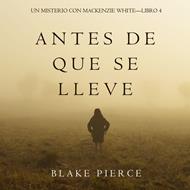 De Blake Pierce, el autor de éxitos de ventas como ONCE GONE (un éxito de ventas #1 con más de 800 críticas de 5 estrellas), llega el libro #4 en la excitante serie de misterio Mackenzie White. En ANTES DE QUE SE LLEVE (Un Misterio con Mackenzie White—Libro 4), la recién graduada agente del FBI Mackenzie White recibe órdenes para encargarse de un nuevo y angustioso caso. En los campos de Iowa están desapareciendo mujeres, y empieza a surgir una pauta. Se teme que haya un asesino en serie haciendo de las suyas, con un ritmo ascendente. Dados sus orígenes en el Medio Oeste, Mackenzie es elegida como la candidata ideal. No obstante, Mackenzie se resiste a regresar al Medio Oeste, en esta ocasión a un escenario seriamente rural que le recuerda demasiado a su propia infancia, a sus propios fantasmas del pasado. También busca al asesino de su propio padre, encontrándose con que la oscuridad le quiere invadir en cada recodo de su viaje. Sumergida de lleno en un mundo de granjas, graneros, y mataderos, de largas distancias de autopistas vacías, a Mackenzie le da la impresión de que está recayendo en los recesos de su propia alma, y en las pesadillas que siempre tuvo miedo de enfrentar. En el mortal juego del gato y el ratón, por fin se da cuenta de la psicosis del asesino al que se enfrenta, y acaba dándose cuenta de que la tierra en la que creció oculta horrores incluso más oscuros y retorcidos que los que ella podía imaginar. Un oscuro thriller psicológico lleno de suspense y emoción, ANTES DE QUE SE LLEVE es el libro #4 de una nueva serie—con una nueva y adorable protagonista—que le tendrá pasando páginas hasta altas horas de la noche. El Libro #5 de la serie de misterio Mackenzie White estará pronto disponible a la venta. También está disponible el libro de Blake Pierce ONCE GONE (Un misterio con Riley Paige—Libro #1), un éxito de ventas #1 con más de 800 críticas de cinco estrellas—¡y una descarga gratuita!