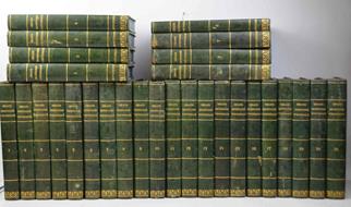 Ventinove volumi di cm. 22,5, pp. 10.000 circa complessive. Bell'antiporta incisa al primo volume. Solida ed elegante legatura uniforma in mezza pelle verde con piccole punte, dorsi lisci con titoli e filetti in oro. Esemplare genuino, fresco e particolarmente ben conservato. I primi 21 volumi compongono il corpus dell'opera , compreso l'indice finale, mentre gli ultimi 8 volumi sono il supplemente completo.