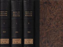 Tre tomi degli "Bibliothèque universelle Revue Suisse et étrangère" con supplemento ad ogni tomo, tomi 4°, 5° e 6° anno 1859 successivamente rilegati in tre tomi. Coperte rigide in mezza tela presentanti segni di usura ai margini con abrasioni agli stessi, tracce di usura da sfregamento ai piatti ove presenti macchioline di decolorazione ed etichetta precedente alla cuffia inferiore di ogni tomo. I volumi potrebbero contenere timbri ed etichette dell'Istituto Veneto, regolarmente acquisiti dalla nostra libreria. Pagine fruibili anche se ingiallite dal tempo in particolare ai tagli e sporadicamente fiorite; lieve ondulazione dei fogli dovuta a minima e naturale umidità dei secoli. Bordi lievemente a barbe. Lingua francese. Numero pagine per tomo 643, 691, 703. Numero pagine per supplemento 412, 380, 409. Numero pagine complessive 3238.