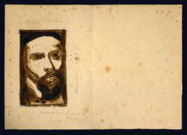 _x000D_- Autoritratto (mm 68x42) a matita e acquarello, al verso della prima carta di un piccolo bifolio (mm 111x79). Bianco il recto della prima carta e la seconda carta. Datato a matita 1959.