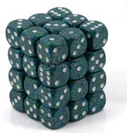Thirty six plastic 12mm Sea Speckled 6-sided Dice. Sea Speckled dice are dark blue with blue/gray/light blue speckles and have white pips.