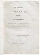 8vo (225x152 mm). [2], 228 pp. Collation: [π]2 [1]6 [π]1 2-148 152. Printed in roman, italic and Greek types. At the l. 1.1r is the dedication to Giovanni Battista Niccolini, dated July 30, 1803, followed by the ‘Argomento', four discourses, the translation and commentary of ‘La chioma di Berenice' and, at the end, the final XIV considerations by Foscolo. At the end are the table of contents and the errata corrige. On the front pastedown bookplate of Baron Horace von Landau (1824-1903, banker of Jewish-Ukrainian origin, collector and bibliophile that collected in his villa “La Pietra” in Florence one of the most important private libraries of his time). At the l. 14.1r marginal manuscript note. Contemporary half calf with gilt title and small gilt ornaments on spine (spine and hinges damaged and cracked). Inside a good copy with wide margins printed on thick paper.