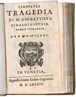 <p>In 8vo (mm 142x92). Pagine 127, [1]. Segnatura : A-H<sup>8</sup>. Marca xilografica al frontespizio, ritratto dell'autore inciso in legno al verso del frontespizio, fregi e capilettera xilografici. Prime carte un po' arrossate, lievi fioriture marginali. Pergamena rigida posteriore, titolo manoscritto al dorso, carta decorata ai contropiatti, tagli spruzzati in rosso.</p> <p>Prima edizione, dedicata da Celso Giraldi a Giovanni Andrea d'Oria, di questa tragedia commissionata da Ercole II d'Este e rappresentata per la prima volta a Ferrara nel 1543.</p> <p>Con la sola eccezione di <em>Orbecche</em>, rappresentata nel 1541 e stampata da Manuzio nel 1543, tutte le tragedie del Giraldi furono pubblicate postume nel 1583 da Giulio Cesare Cagnacini, ciascuna con il ritratto dell'autore e con una dedica diversa del figlio di Giraldi, Celso. Le tragedie erano vendute sia separatamente, che in un unico volume dedicato ad Alfonso II d'Este. Le altre tragedie del Giraldi stampate dal Cagnacini nel 1583 sono: <em>Orbecche</em>, <em>Altile</em>, <em>Didone</em>, <em>Antivalomeni</em>, <em>Cleopatra</em>, <em>Arrenopia</em>, <em>Euphimia</em>, <em>Epitia</em> e <em>Selene</em>.</p> <p>Giraldi fu una figura chiave nella storia del teatro del Rinascimento. Egli per primo introdusse il lieto fine nella tragedia, innovazione inizialmente osteggiata dai drammaturghi dell'epoca, che fu sdoganata e portata alla consacrazione qualche anno pi&ugrave; tardi, in Italia ed altrove, da Giambattista Guarini, il primo anche a formulare una teoria della tragicommedia. Bench&eacute; non vi siano prove dirette che Shakespeare conoscesse i drammi del Giraldi, pi&ugrave; di uno studioso ha messo in correlazione <em>Anthony and Cleopatra</em> &nbsp;con la <em>Cleopatra</em> di Giraldi e &