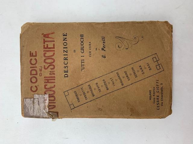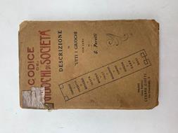 In 16 (cm 12 x 19), pp. 285 + (1 bianca) + (2) di indice. Nastro adesivo al margine superiore dei piatti e del dorso. Brossura editoriale. Pagine brunite in maniera uniforme. Manuale dei giochi di carte e dei giochi di societa'. Sono descritti: tarocco, tressette, briscola, bazzica, visth, biliardo, domino, scacchi, dama, giochi di sala, ecc... con l'aggiunta di un capitolo sui giuochi di azzardo. Non datato ma 1920 circa.