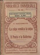 Opera composta da due drammi; "La colpa vendica la colpa" dramma in cinque atti e "Il poeta e la ballerini"dramma in tre atti. Numero "131" della collana "Biblioteca Universale". Copertina in carta spessa ingiallita dal tempo mostrante segni di usura ai margini con piccoli strappi alla cuffia inferiore, etichetta precedente e scritta a matita al piatto anteriore e piccole macchioline di fioritura ai piatti. Pagine fruibili anche se brunite dal tempo e sporadicamente fiorite. Bordi a barbe lievemente logorati. Numero pagine 128.