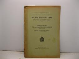 In 8, pp. 76. Danni rip. al d. Br. ed. Saggio relativo alla necessita' di una riforma della scuola primaria 'in senso scientificamente educativo; vale a dire il porre in atto, cominciando dall'Asilo infantile e proseguendo in tutti i corsi, che diro' popolari, di quanto puo' dare agli allievi: salute, robustezza fisica, fermezza e lealta' nel carattere ed una istruzione intellettuale e pratica, adattata all'intelligenza e alle condizioni sociali'. In appendice al discorso inaugurale altri argomenti: l'azione educativa nelle scuole primarie. Scuola e famiglia; Il digiuno accanto alla sazieta', ed altri contrasti, sui banchi delle scuole elementari; Gli effetti finali delle premiazioni scolastiche; Note sull'igiene nelle scuole elementari; Cenni sulla tecnica dell'insegnamento oggettivo; Cenni sulla tecnica del lavoro manuale scolastico, etc...