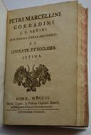 Cm. 22, pp. (8) 204. Fregio al frontespizio, capolettera ornati e finalini. Solida legatura coeva in piena pergamena rigida con titoli manoscritti al dorso. Esemplare genuino e ben conservato. Edizione originale ed unica di quest'opera erudita in cui l'autore cerca di ricondurre storicamente il suo paese alla vecchia sede vescovile. Il Cfr. Lozzi 5004 "Non comune".