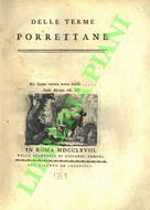 Roma, nella stamperia Giovanni Zempei, 1768, 4to legatura in cartonato muto recente, pp. VI-(2)-283 con incisione in rame al frontespizio, 6 testatine, 6 finalini e 6 capolettere, tutti figurati, incisi in rame + 4 tavole calcografiche ripiegate fuori testo (una grande, panoramica). Libro interessante sia dal punto di vista storico sia dal punto di vista scientifico (per le analisi delle acque e la spiegazione delle virtù dietetiche e mediche) sia per la bellezza della veste editoriale, con le eleganti vignette, i capolettere figurati, le tavole con le piante e le strutture delle Terme. Bell'esemplare, in barbe. Prima edizione. Lozzi, 3794: "Raro". Melzi, III, 136. Frati, 476.