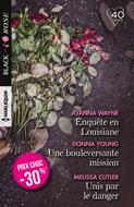 Enquête en louisiane, Joanna Wayne Où que vous alliez, je vous retrouverai, toi et tes enfants… Depuis qu'un déséquilibré l'a menacée à New York, Jodie vit dans la peur. Même ici, en Louisiane où elle a trouvé refuge, elle peine à reprendre une vie normale… Son inquiétude s’aggrave encore quand un inconnu lui envoie des fleurs. Terrorisée, Jodie demande son aide à Ray Kostner, un éminent avocat… qui ignore tout de l’existence de Blake et Blair, dont il est pourtant le père. Une bouleversante mission, Donna Young En voyant Calvin West s’avancer vers elle, Julia retient son souffle. Jamais elle ne pensait revoir un jour celui qui l'a trahie des années plus tôt, en la quittant alors qu’ils devaient se marier. Et encore moins avoir à lui demander de la protéger. Pourtant, elle a dû se résoudre à se tourner vers lui, le meilleur garde du corps qu’elle connaisse : depuis qu’elle travaille pour le président des États-Unis, elle est la cible de nombreuses menaces… Unis par le danger, Melissa Cutler Trop beau, trop sûr de lui : Aaron Montgomery est exactement le genre d’hommes que Camille déteste. Elle change pourtant d’avis le jour où, kidnappée par les criminels sur lesquels elle enquête, elle se retrouve ligotée… tout contre Aaron. Comment s’est-il retrouvé là ? Elle l’ignore. Mais sa présence lui redonne espoir. Car, en s’alliant, ils peuvent espérer échapper à leurs ravisseurs…