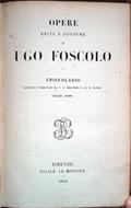 Tre volumi in-16° (17,5 x 11,2 cm), pp. (6), VI, 584, (2) (6), IV, 404, (2) (8), III, (1), 476, (2), legatura coeva in tela con titoli in oro e fregi in oro e a secco ai piatti. All'antiporta del tezo volume, tavola fuori testo, protetta da velina, raffigurante la "Tomba di Ugo Foscolo, nel Cimitero di Chiswick nelle vicinanze di Londra". Al primo volume, fenditura lungo la cerniera posteriore, ma legatura assolutamente solida firma d'appartenenza alla prima pagina bianca. Due minime mancanze al dorso del terzo volume, lontano dai titoli. Sempre al terzo volume, nel margine esterno delle prime sei pagine non numerate, della tavola fuori testo e delle tre pagine con numerazione romana, alone di colore marrone chiaro di 3,1 cm di altezza per 1,3 cm di larghezza, lontano dal testo. Sporadiche, leggere fioriture, per il resto ottimo esemplare. Si tratta dei volumi sesto, settimo e ottavo delle "Opere edite e postume di Ugo Foscolo".