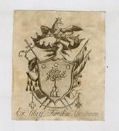[Fermo?], [s.n.t.], [fine del XVIII sec.], ex-libris inciso in rame, raffigurante lo stemma della famiglia con il titolo nella parte inferiore, sotto lo stemma. L'ex-libris - che era stato incollato al verso del frontespizio d'un volume - è stato a suo tempo ritagliato e reca al verso una porzione del frontespizio sul quale era stato incollato, con caratteri impressi in rosso e nero.