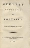 [Kehl], de l'Imprimerie de la Société Littéraire-Typographique, 1785, in-8, br. coeva con titolo manoscritto su tassello di carta al dorso, pp. [4], 515, [1]. Solo un volume delle "Opere. Ottimo esemplare, a pieni margini.