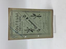 In 8 (cm 16,5 x 23,5), pp. 32 copertine comprese. Fori al dorso. Brossura editoriale. Catalogo illustrato della Ditta Caudano di Torino. Comprende coltelli, tritacarne, articoli casalinghi, cavatappi, spilloni da posizionare sulle vivande, macchine tritacarne, spremifrutta, insaccatrici, stritola ghiaccio, macchina per pulire i coltelli, rasoi, ecc...