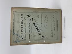In 8 (cm 16,5 x 23,5), pp. 24 copertine comprese. Fori al dorso. Brossura editoriale. Catalogo illustrato della Ditta Caudano di Torino. Comprende mole per arrotare di pietra arenaria e di smeriglio, pietre di Candia, d'Arkansas, del Belgio, ecc... Presenti in fine alcuni modelli di rasoi.