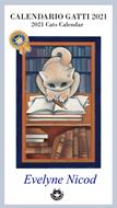 Calendario gatti 2021 a forma di libro. Ogni mese ha due facciate, una con immagini di gatti disegnate da Evelyne Nicod, l'altra con comode righe per gli appunti giornalieri. Simile al tradizionale calendario spiralato da appendere, si può anche impiegare come agenda mensile da portare comodamente in viaggio.