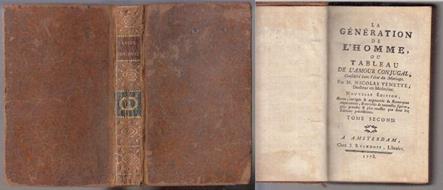 *** Autore: NICOLAS VENETTE Titolo: LA GENERATION DE L'HOMME OU TABLEAU DE L'AMOUR CONJUGAL TOME SECOND Casa Editrice: AMSTERDAM chez RYCKHOFF& isbn:& 2021210094311 Anno edizione: 1778& Copertina: RIGIDA Pagine: 406 Misure: 15 X 23 cm Descrizione: LEGATURA RIGIDA in PELLE, TITOLI AL DORSO su TASSELLI, FREGI in ORO AL DORSO, con INCISIONI FUORI TESTO, PRESENTI LE TAVOLE 5,6,7,9,10,11,12, PAGINE ROSSE AI TAGLI, CONDIZIONI OTTIME. ***