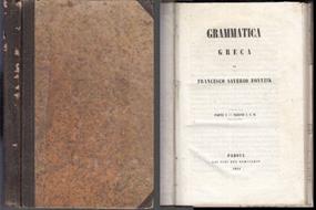 *** Autore: FRANCESCO SAVERIO FOYTZIK Titolo: GRAMMATICA GRECA PARTE I SEZIONI I e II Casa Editrice: PADOVA COI TIPI DEL SEMINARIO isbn:  2020080011992 Anno edizione: 1854 Copertina: RIGIDA Pagine: 180 Misure: 14 X 22 cm Descrizione: LEGATURA RIGIDA IN CARTONE MUTO, CON TRE TAVOLE FUORI TESTO POU' VOLTE RIPOEGATE, LEGGERE ABRASIONI IN COSTA, INTERNAMENTE CONDIZIONI OTTIME. ***