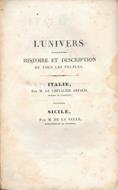 in 8°, pp. 384 (Italie); pp. 96 (Sicilie), 120 tavv. (di cui 96 per l'Italia e 24 per la Sicilia), 2 carte geogr. rip.; bross. edit. ill., testo su 2 colonne. Collana 'L'Univers pittoresque. Histoire et description de tous les peuples'. I due autori, diplomatico il primo e funzionario governativo il secondo, entrambi cultori di storia e d'arte, rimasero affascinati dall'Italia in generale e dalla Sicilia in particolare, e collaborarono a quest'opera ricca di notizie di storia, arte, costumi, usi e tradizioni locali. Spaccatura riparata al ds. e rare fior. ma buon esemplare. 249-27