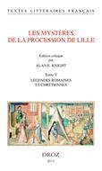 Le tome V des Mystères de la procession de Lille, le dernier de la série, contient l’édition critique de huit mystères inspirés des légendes romaines et chrétiennes. Ces pièces dramatiques sont connues par un manuscrit unique conservé à la Herzog August Bibliothek à Wolfenbüttel, qui renferme en tout soixante-douze mystères joués à l’occasion de la grande procession annuelle de Lille. Les mystères présentés par Alan E. Knight dans ce volume traitent la vie des héros romains comme Mucius Scævola et Atilius Regulus que l’imagination populaire a embellie d’exploits fabuleux. Le volume contient aussi trois pièces basées sur des légendes chrétiennes, y compris une vie de sainte et un miracle de la Vierge. Le volume se termine par une moralité de l’Assomption, une pièce hors série, puisqu’elle est tout à fait non historique. Les personnages sont des abstractions pures et non pas des personnes censées avoir vécu. Enfin, ce dernier tome est accompagné d’un lien pour télécharger toutes les illustrations couleurs du manuscrit.