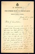 <p>Bifolio manoscritto autografo (mm 210x135) su carta intestata: &ldquo;R. Istituto di Studi Superiori Pratici e di Perfezionamento. Sezione di Filosofia e Filologia&rdquo;. Nella lettera il Pistelli invita l'&ldquo;<em>Egregio Commendatore</em>&rdquo; a far pervenire quanto prima al Ministro della Pubblica Istruzione la domanda gi&agrave; da tempo presentata dal Dott. Giovanni Poggi. Un po' brunito, nota manoscritta con matita blu al recto della prima carta (&ldquo;Urgente&rdquo;), bianco il verso della prima e della seconda carta.</p> <p>E<span class=''sc''>rmenegildo</span> Pistelli: sacerdote, filologo e scrittore, divenne padre calasanziano nel 1884. Laureato in lettere a Firenze, insegn&ograve; presso le Scuole pie per molti anni, e dal 1903-1904 lingua latina e greca presso il R. Istituto di studi superiori di Firenze. Ricopr&igrave; la carica di assessore, occupandosi delle scuole del comune di Firenze.&nbsp;</p>