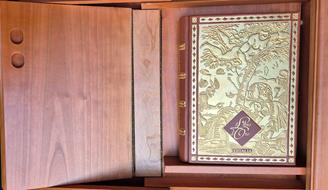 Prefazione in Italiano, Giapponese, Inglese, Francese, Tedesco, Spagnolo, Arabo, Russo, Roma, Pelle con custodia, in 8°, 30 pagine con lamine in oro puro 999.9 (24Kt) del peso do 3 gr cadauna per un totale di 90 grammi., Di questa opera ne sono state stampate complessivamente 250 copie., La nostra è la 123, Il Libro d'Oro è un libro che tratta il cammino dell'uomo dalla preistoria all'era moderna. La copertina in pelle proveniente da spalla di vitello, con concia vegetale al sego e tamponata all'anilina.Incisioni a sbalzo sul piatto, sul dorso e sul retro decorate in oro zecchino 22Kt. Targa in oro per dedica personalizzata all'interno della copertina.Il libro è contenuto in uno scrigno in legno apribile per poterlo esporre.