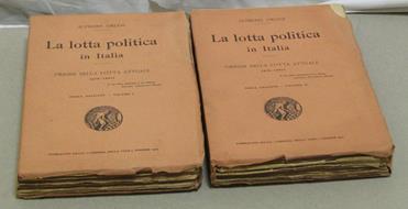 LA LOTTA POLITICA IN ITALIA Origini della lotta attuale (476 - 1887).FIRENZE, LIBRERIA DELLA VOCE, 1913. PRESENTI SOLO I VOLUMI I. e II. - In-8 - bross. edit. a stampa - pp. 384 / 374 - intonsi - una piccola mancanza all'angolo sup. del piatto ant. del II. vol. (cm.1x2) - buoni esemplari - anche singolarmente - cad. âÂ'¬ 20