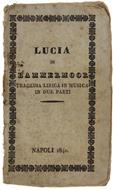 Titolo: LUCIA DI LAMMERMOOR. Tragedia lirica in due parti. Parte I- LA PARTENZA. Parte II- IL CONTRATTO NUZZIALE. Musica del signor Maestro Cav. Gaetano Donizzetti. - Cammarano Salvatore. - Giuseppe D'Ambra, - 1840