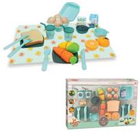 Set colazione con 2 bicchieri, 2 piatti,4 posate, una padellina, 1 pentolina,2 confezioni alimenti, 4 uova, con porta uova 1 toast, 1 carota, 1 pannocchia eun’arancia