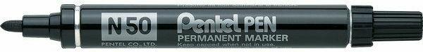 Pentel N 50. Colore penna: Blu, Tipo di tappo: Tipo di punta, Colore del prodotto: Blu. Quantità per pacco: 12 pezzo(i) Marcatore permanente con punta conica extra forte sintetica e fusto in metallo. Alta indelebilità dell'inchiostro. Adatto a scrivere su tutte le superfici: legno, vetro, gomma, plastica, metallo, carta e cartone. Lunghezza di scrittura minima 1000m.