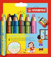 STABILO woody 3 in 1 duo è il matitone dalle infinite possibilità creative: matita colorata, pastello a cera e acquarello in un unico strumento con mina a 2 colori per il doppio del divertimento! E' pensato sia per i bambini dai 3 anni in su che amano colorare e sperimentare, sia da professionisti e creativi che esigono molto dai loro strumenti. STABILO woody 3 in 1 duo dura a lungo: il suo fusto contiene la stessa quantità di colore di 8 matite colorate standard. Grazie alla mina XXL (10 mm) e al fusto grosso e corto, è ideale per le mani dei bambini e resiste anche alle pressioni più forti. Questo matitone scrive su molte superfici diverse come vetro, legno, metallo, cartone e molte altre, ed è perfettamente lavabile dalle superfici lisce con un semplice panno umido! Grazie al doppio colore della mina, STABILO woody 3 in 1 duo è così versatile che può essere utilizzato da grandi e piccini per tantissime tecniche creative come l'acquarello, la tecnica a graffito, il frottage o il colore a dita. Il suo colore intenso ed opaco, inoltre, è perfetto anche per colorare su cartoncini scuri. E' composto da legno naturale certificato PEFC ed è sicuro per i bambini, lavabile e atossico. STABILO woody 3 in 1 duo è disponibile in 10 matitoni con doppio colore e in astucci da 5, 6 e 10 con temperino incluso.