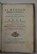 Cm. 21, pp. xxiv, 248. Legatura coeva in cart. alla rustica con nervi passanti. Una lieve gora alle ultime carte, peraltro esemplare genuino e ben conservato, ad ampi margini. Cosi Melzi: "L'opera doveva essere seguita da un secondo volume. Sono tre libri divisi in capitoli, dettati in versi martelliani. L'autore, nativo di Campo San Pietro nel Padovano, era medico condotto in Badia del Polesine nel 1768, ed aveva ottenuta una certa fama, che di poi andò diminuendo. Si seppe in appresso che, sebbene laureato, aveva calcato i palchi da ciarlatano...".