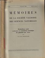 Annata incompleta in cinque fascicoli, dal n. 80 al n. 85 rispettivamente del 31 gennaio- 20 febbraio- 15 marzo- 30 giugno- 31 ottobre, della serie delle Memorie a cura della Società Vaudoise des sciences naturelles. Brossura in cartoncino, lievemente brunita e segnata dal tempo. Pagine in buono stato, salde, con ampio margine ed arricchite da figure e tabelle nel testo. Numero pagine 362 con numerazione consecutiva.