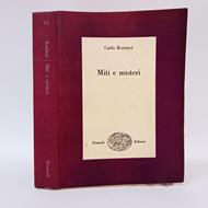 Einaudi (Collezioni di studi religiosi, etnologici e psicologici n. 15); 1950; Noisbn ; brossura ; 22 x 16 cm; pp. 504 ; Prefazione dell'autore. A cura di Angelo Brelich. 10 tavv b/n fuori testo. ; Presenta segni d'uso ai bordi (senza mancanze nè lacerazioni), dorso con segni di lettura, interno con rare sottolineature, fioriture alle prime pagine, alcuni fogli ancora chiusi. ; Accettabile (come da foto). ; "Miti e misteri" apparve la prima volta nella collana einaudiana di studi etnologici. Kerényi vi aveva raccolto quindici studi, frutto delle indagini sempre più approfondite e rivelatrici che aveva condotto sull'antica religione ellenica, tentativo originale di valorizzare l'eredità classica per l'uomo contemporaneo. L'incontro con la "grande mitologia" aveva portato Kerényi alla scoperta dei temi mitologici fondamentali, di cui tutti i miti tramandati sino a noi sono altrettante variazioni; l'incontro con Jung ebbe a chiarire in lui i rapporti tra gli archetipi psichici e le immagini storicamente concrete della religione greca. In Kerényi, la teologia diventa antropologia: la religione greca non vi appare come il frutto di una fantasia sfrenata o di una ingenuità "primitiva", né come il casuale confluire di elementi culturali disparati, ma come una risposta coerente e articolata al problema della presenza dell'uomo nel mondo. ; L'immagine se disponibile, corrisponde alla copia in vendita.