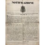 Notificazione. Papa Pio IX in vista della mancanza di grano e granturco e delle rispettive farine in alcuni territori dello Stato Pontificio, ammette l'introduzione di grano estero esente da dazi
