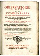 <p>Un volume di quattro in-folio (mm 378x250); pp. (16), 422, (70). Segnatura: &dagger;8 A-Gg8 Hh6. Occhietto, frontespizio stampato in rosso e nero, iniziali e fregi xilografici. Lievi fioriture diffuse, lievi aloni marginali.&nbsp;</p> <p>Cartonato coevo con tassello e titolo manoscritto al dorso. Mancanze alla cuffia superiore, aloni e piccole macchie ai piatti. Bell'esemplare in barbe. Nota di possesso manoscritta e timbri al frontespizio.</p> <p>Francesco Maria Constantini (1639-1713) nato a Venarotta (Ascoli Piceno) fu attivo come avvocato a Roma e ad&nbsp;Ascoli Piceno. In quest'opera l'autore&nbsp;raccolse&nbsp;diverse&nbsp;osservazioni forensi accompagnate da rispettivi commentari.&nbsp;</p>