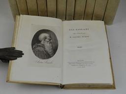 Dodici volumi di cm. 22,5, pp. oltre 3.000 complessive. Bel ritratto di Pietro Bembo inciso in rame all'antiporta del primo volume. Solida ed elegante legatura coeva in piena pergamena rigida, dorsi lisci con titoli in oro su doppio tassello bicolore. Esemplare particolarmente marginoso (in barbe), genuino ed in ottimo stato di conservazione. Ex libris nobiliare inglese. Stimata e nitida edizione che comprende tutta la produziuone letteraria del Bembo così suddivisa: Gli Asolani; Le Rime, Della Istoria Viniziana; Le Lettere a' sommi Pontefici ed a' Cardinali e ad altri Signori e Persone Ecclesiastiche scritte...; Della Volgar Lingua. In fine all'ultimo volume vi si trovano gli ampi indici. Cfr. Fusi: "Quest'edizione comprende tutte le opere Italiane del Cardinale Bembo...".