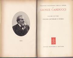 Copertina in piena tela con fregi in oro al dorso. Lievi segni d'uso. Volume dell'Edizione Nazionale delle Opere di Giosue Carducci in 30 volumi. Con un ritratto del poeta diverso in ogni volume. La più completa edizione degli scritti del grande poeta, pubblicata per celebrarne il centenario della nascita, curata da un comitato di insigni studiosi tra i quali Luigi Federzoni, Alfredo Panzini, Ettore Romagnoli, Guido Mazzoni. Bologna, Zanichelli 1935-1944. Conforme all'edizione critica del 1892, condotta sopra gli originali autografi del Poeta.