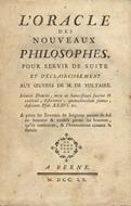 L’oracle des nouveaux philosophes. Pour servir de suite et d’éclaircissement aux oeuvres de M. de Voltaire. A Berne, 1760, pp. XVI, 374 (Legato con:) [Chaumeix A.J.]. Le sentiment d’un inconnu sur l’Oracle des nouveaux philosophes pour servir d’eclai