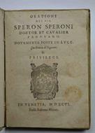 Cm. 21, pp. (8) 215 (1). Marchio tipografico al frontespizio ed al colophon ed un bel capolettera istoriato. Legatura del tempo in piena pergamena semirigida con nervi passanti e titoli ms. al dorso. Timbro della censura ecclesiastica al frontespizio. Ottimo esemplare, genuino e marginoso. Comprende le seguenti nove orazioni: Al Re Filippo di Spagna; Al Re Antonio di Navarra della Pace col Re di Francia; In morte di Giulia Varrana Duchessa di Urbino; Al Principe di Venezia Luigi Mocenigo, nella sua creazione; In morte del cardinal pietro Bembo; A Giacopo Cornaro Capitanio di Padova nella sua partita; A Girolamo Cornaro Capitanio di Padova nella sua partita; Contra le Cortigiane; A gli Accademici Infiammati di Padova quando fu suo Principe.