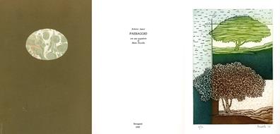 Una poesia di Roberto Sanesi (Paesaggio), con un'acquaforte originale a colori, numerata e firmata di Mario Rossello (cm 23,7x16,5; foglio cm 33x24)