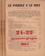 Volume numero 1-2 e 3-4, anno VI, 1964 della rivista trimestrale Le parole e le idee. Copertine leggermente macchiate e brunite al dorso e ai piatti. Copertine lievemente stanche agli angoli, ai margini, al dorso. Pagine salde alla cerniera, con ampio margine, brunite, così come i tagli. Presente leggera fioritura ai tagli. Numero pagine 364.