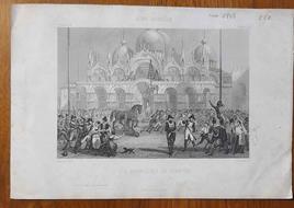 16,5x24 cm di cui parte incisa 16,5x11,2. l'incisione rappresenta la asportazione dei cavalli bronzei di Lisippo dalla terrazza della Basilica di San Marco, la difesa dai soldati francesi e in primo piano, il popolo che protesta. Incisione tratta dal volume H. de Venice della Imprimerie Chardon ainé rue Hautefeuille 30, Paris