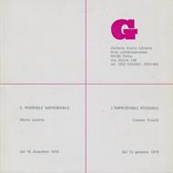 Catalogo con le due brochure delle mostre tenutesi presso la Galleria Giulia Libreria Arte Contemporanea di Roma: Il possibile improbabile ( dal 16 dicembre 1978 all'11 gennaio 1979. con testo di Mario Lunetta. Opere di: Ugo Attardi, Giulio Ciniglia, Vincenzo Gaetaniello, Piero Guccione, Gino Guida, Paolo Giuotto, Titina Maselli, Franco Sarnari, Lorenzo Tornabuoni, Pasquale Verrusio, Renzo Vespignani) - L'improbabile possibile (dal 12 gennaio al 2 febbraio 1979. con un testo di Cesare Vivaldi. Opere di: Franco Angeli, Franco Baruchello, Mario Ceroli, Giuseppe di Nunzio, Pablo Echaurren, Tano Festa, Giosetta Fioroni, Nedda Guidi, Gianni Novak, Claudio Perri, Mario Schifano, Simona Weller). con tavole in bianco e nero e note biografiche degli artisti