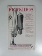 Pieghevole di 8 facciate (ciascuna misura cm 12,5 x 20,5) + foglietto sciolto interno su carta rosa con listino prezzi. Pieghevole pubblicitario illustrato con alcuni obiettivi con messa a fuoco automatica, accessori e inquadratori Praxidos con note tecniche e caratteristiche costruttive.
