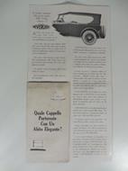 Pieghevole pubblicitario ripiegato (aperto misura cm 25,5 x 32,5 circa). Pubblicita' del neverleek, tessuto per capote delle vetture di classe. Alla facciata anteriore sono ritagliate le sagome di due cappelli, mentre alla successiva facciata e' applicato un campioncino di tessuto. La domanda e': Quale cappello portereste con un abito elegante? Il cappello con il neverleek e' elegante, l'altro cappello, che invece non e' costituito da materiale di pregio, ma da un materiale qualunque di una 'capote meschina' risulta di poco valore. Da qui lo slogan: Una capote sciupata su una bella vettura e' come un vecchio cappello logoro portato con un abito di societa'. Seguono note tecniche sul tessuto neverleek. Qualche alone alla facciata anteriore.