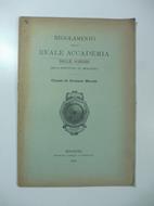 In 8 (cm 16,5 x 24), pp. 13 + (3b). Segni con lapis rosso al piatto anteriore. Alcune annotazioni al contropiatto anteriore. Regolamento della Reale Accademia delle Scienze dell'Istituto di Bologna, Classe di Scienze morali.